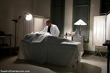 Nurse Sin is one horny slut! She has fucked around the hospital long enough. Dr Davis puts an end to her promiscuous ways. While in bondage, an electro plug is inserted into her ass. She is spanked and sucks cock while her asshole is shocked. Then she is bound in plastic wrap and caned, zapped, suctioned and anally fucked. Lastly, while rendered immobile with medical restraints and rubber tubing, she is whipped and fucked.
